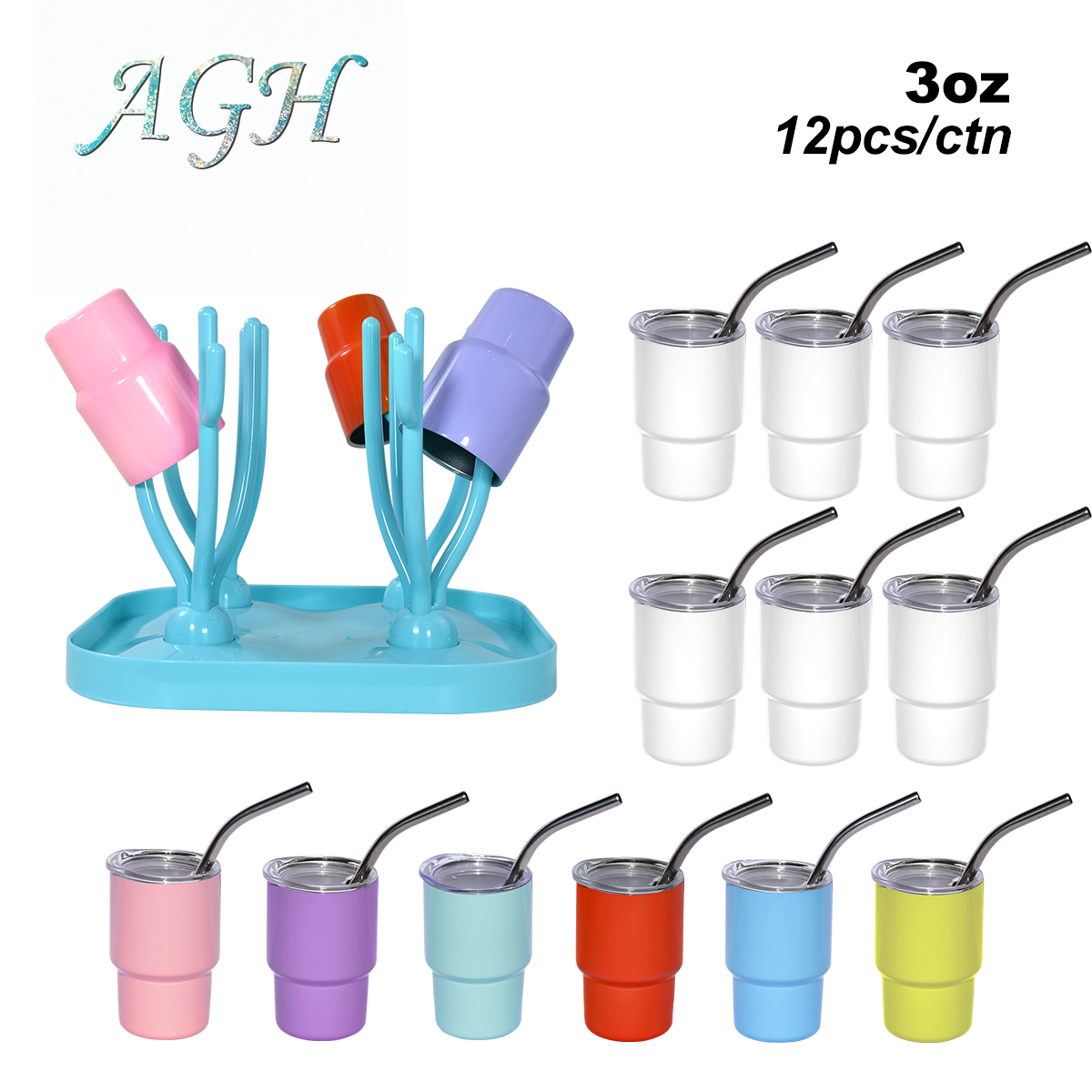 - Product Name: AGH US warehouse 3oz sub mini shot glass tumbler with metal straw mixed colors 48pcs/case with drying rack (sub white+ sub mixed 6-colors)
